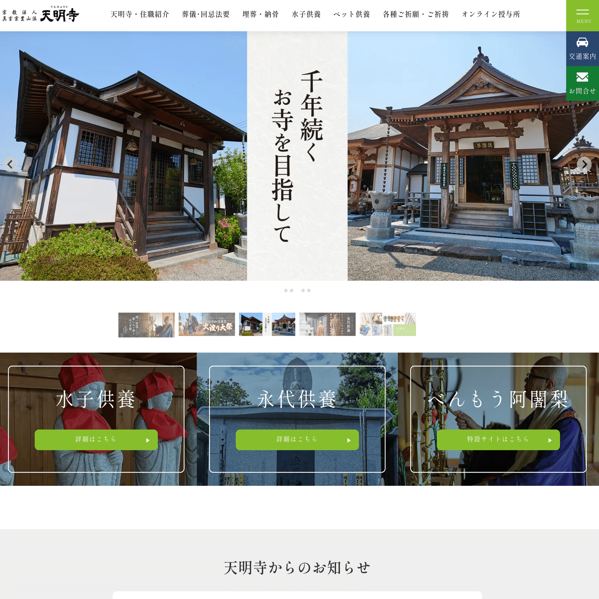 前橋のお寺で永代供養| 宗教法人 真言宗 豊山派 太子山 天明寺群馬県前橋市にある天明寺(太子山 神通院 天明寺)の公式サイトです。不動明王をご本尊とし、亡き方の安らぎはもちろん、今 生tenmyoji.jp